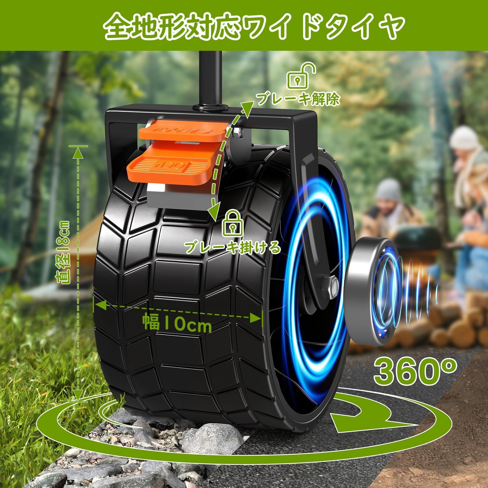 「安定に動かせるゴム製中型タイヤ」 音が静かでグリップ力も優れてた細すぎず大きすぎずのちょうど良いゴム製の中型タイヤを採用するため、凹凸がある道でも安定して動かすことができるうえ、山道、砂利道、砂浜などアウトドアの様々なシーンで活躍することに期待できます。ストッパーも前輪に搭載してあり、傾斜のある道でも停車しても転がらず、荷物の上げ下ろしが安定してスムーズに行えます。