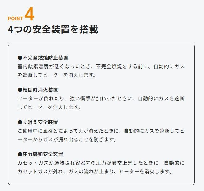 安全装置 圧力感知安全装置、立消え安全装置、転倒時消火装置、不完全燃焼防止装置