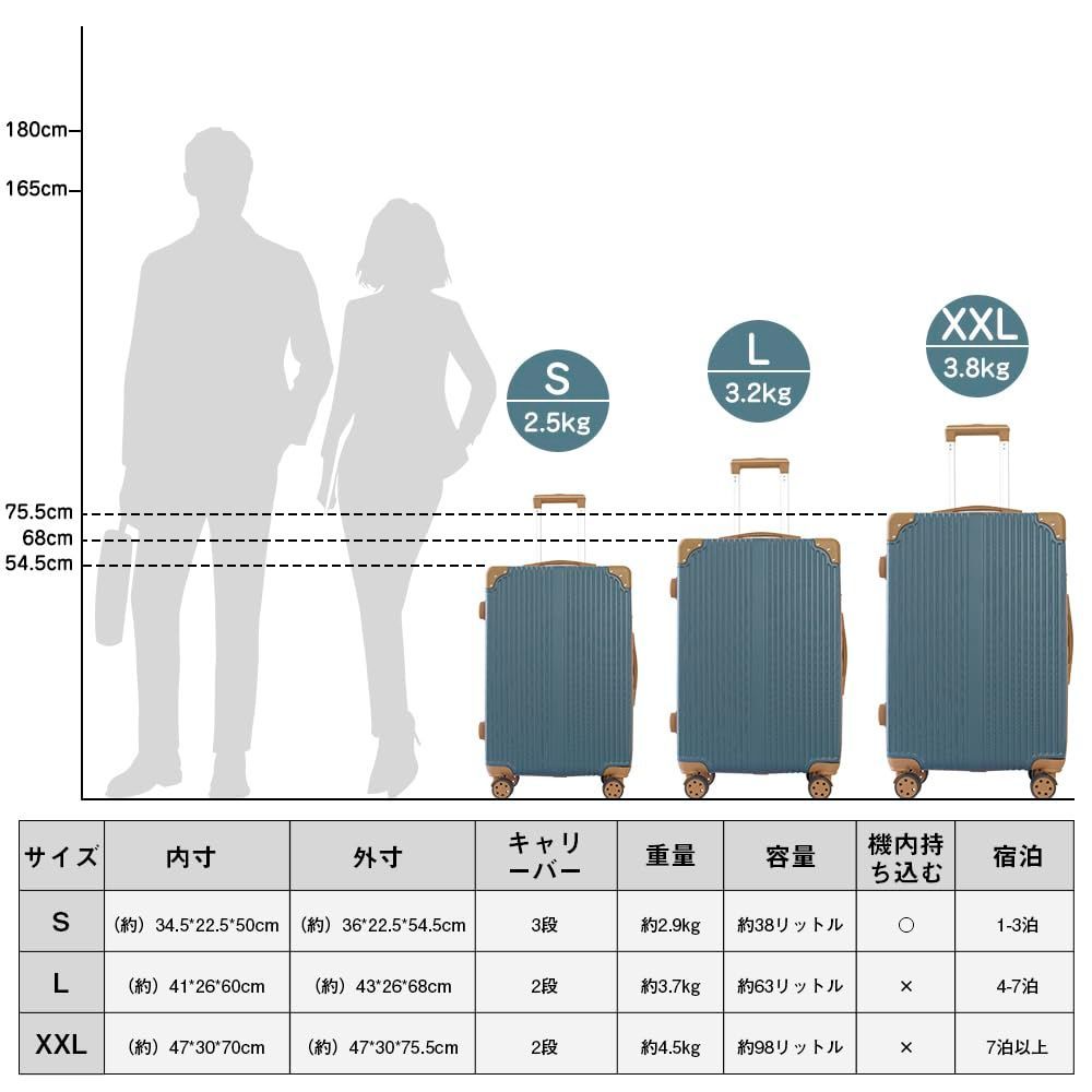 【サイズ】Sサイズの内寸は50*34.5*22.5cm、重さ:2.5kg 超軽容量、は38リットル、1~3泊に似合います。Sサイズは一部の航空会社だけに適用しますので、事前に航空会社に確認したほうがいいんです。Lサイズの内寸は60*41*26cm、重さ:3.2kg 、容量は63リットル、4~7泊以上。XXLサイズの内寸は70*47*30cm、重さ:3.8kg、 容量は98リットル、7泊以上