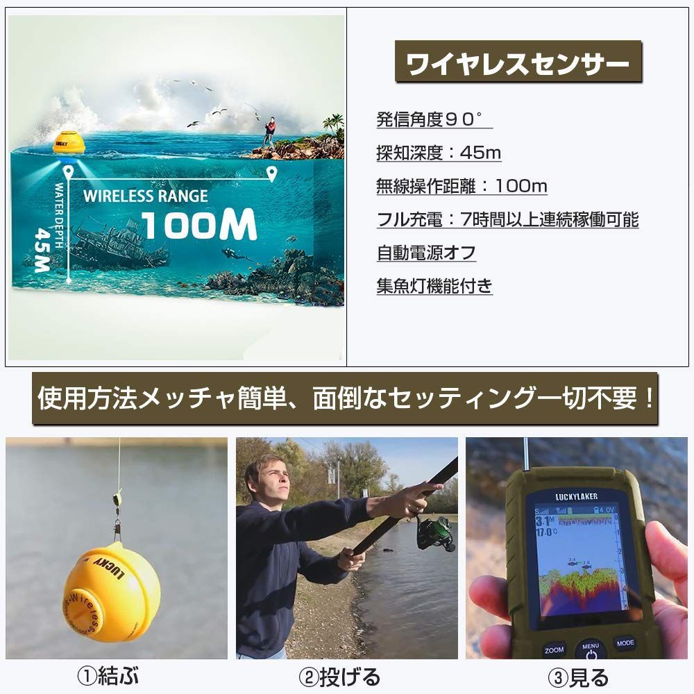 LUCKYLAKER 防水 ワイヤレス 魚群探知機 ポータブル カヤック 魚探 海 船 sup 堤防 ボート バス釣り ワカサギ釣り 小型 釣り