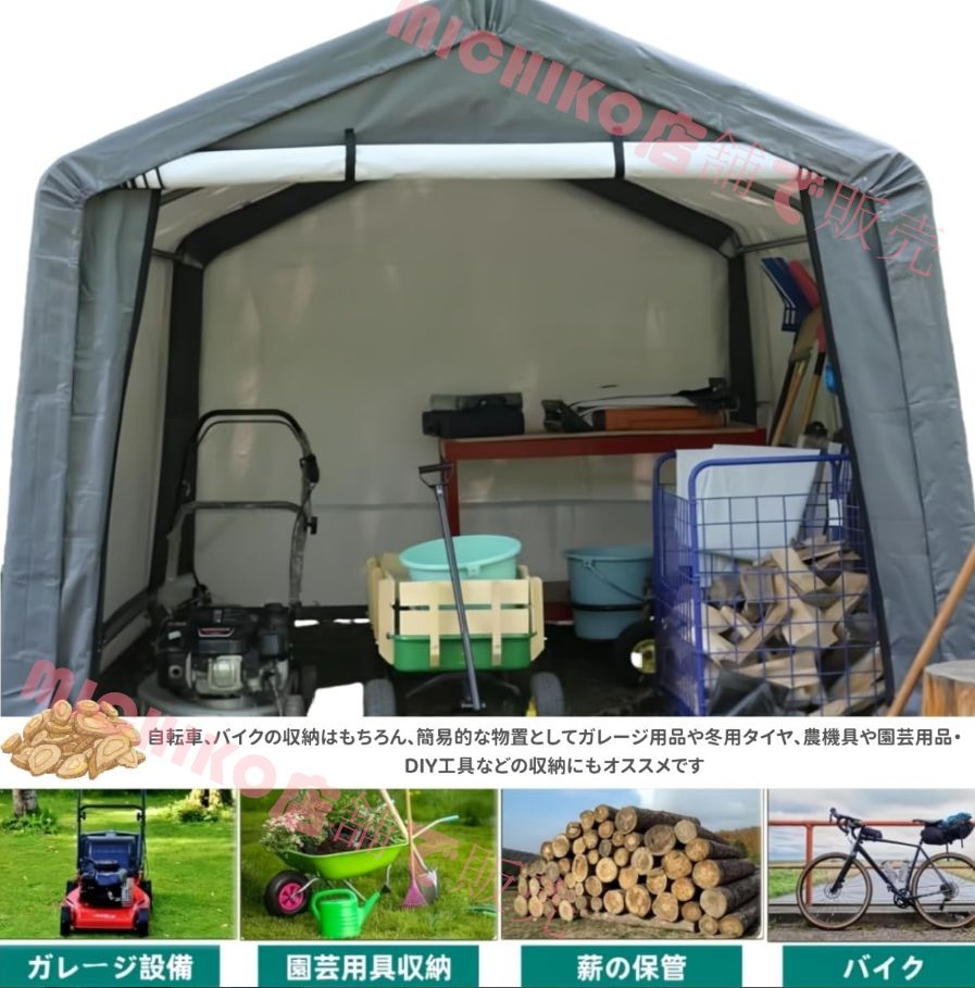 【幅広い用途で活躍】自転車、バイクの収納はもちろん、簡易的な物置としてガレージ用品や冬用タイヤ、農機具や園芸用品DIY工具などの収納にもオススメです。屋外の簡易休憩所としてもご利用できます。