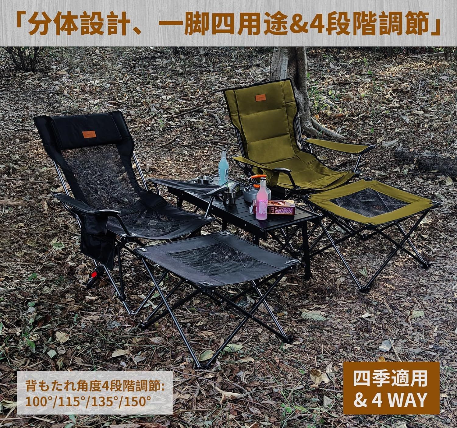 【4WAY設置可能、分体設計、テーブル連結設計】◆1.寝ている時はフットレストとして使える 、自由に延長できるフットレスト、高身長の方も思う存分楽しめる 。リラックスするのに非常に適しています!◆2.一人で使用する際は、フットレストを一方に移動させてサイドテーブルとして使用し、小物を置くことができます。サイドテーブルとしてのサイズは54x54で非常に大きく、多くのアウトドア用品を収納でき、とても便利です。◆3.リクライニングチェアとしても、小さな椅子としても使用でき、2通りの椅子として楽しめ、様々な機能を存分に楽しめます。◆4.フットレストを外せば、普通の椅子として使え、釣りやアウトドアキャンプに軽量で便利です。