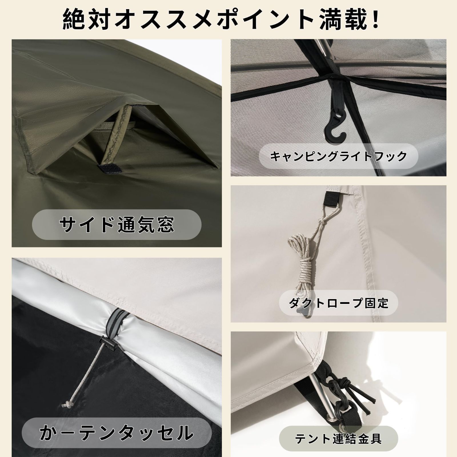 【さまざまな用途】1人テントアウトドア、ソロキャンプ、野外フェス、ピクニック、ビーチ、花見、釣り、登山、運動会などに適用されています。設営簡単、持ち運びも簡単なのでいろんなシーンで大活躍。災害時の防災用品としても使えます。