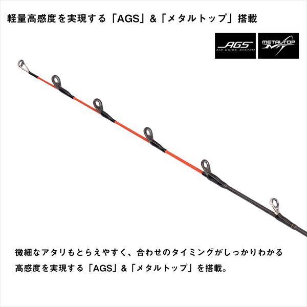 ヒラメ釣りで必要な食い込み性能と感度をメタルトップで両立! 高弾性細身肉厚設計化でパワーと粘りを両立。食い込み性能と手感度の良さが魅力のメタリアヒラメが高弾性細身肉厚設計化でパワーと粘りを両立してモデルチェンジ。ヒラメ釣りで必要な食い込み性能と感度を細径メタルトップで両立。ブランクを細身高弾性化し、操作性と粘り強さを格段に向上させた上で、#1節をよりしなやかにチューニングすることにより、ファーストバイトからの食い込み性能に磨きをかけた。穂先に「AGS」(オールSiCリング)とメタルトップ、リールシートに軽量でフィット感に優れたエアセンサーシートスリムフィットを搭載することで、大ヒラメとのファイト時も手が痛くなりにくい快適な釣りを実現した高感度軽量ヒラメ竿。持ち運びに便利なセンターカット2ピース。