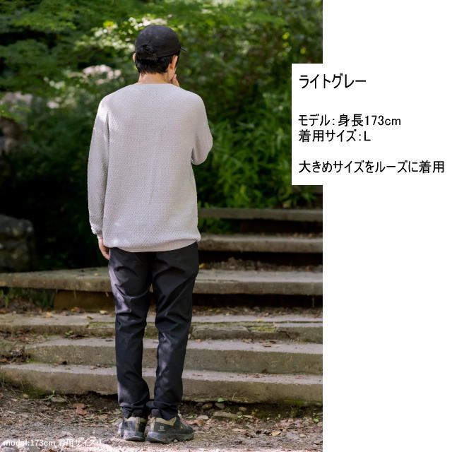ウールを70%混紡し、保温性を高めました。冬場の登山でも身体の熱を逃がさず、体温をキープできて安心。ベースレイヤーとしても、ミドルレイヤーとしても活躍します。さらに指ぬき付きで、手のひらを冷やさず細かな作業ができる。スマホやカメラで、一瞬のシャッターチャンスを逃しません。大きめサイズを緩めに着こなせば、タウンユースでも様になるシルエット。このために敢えて、男性にとってもルーズフィットなLサイズをご用意しました。
