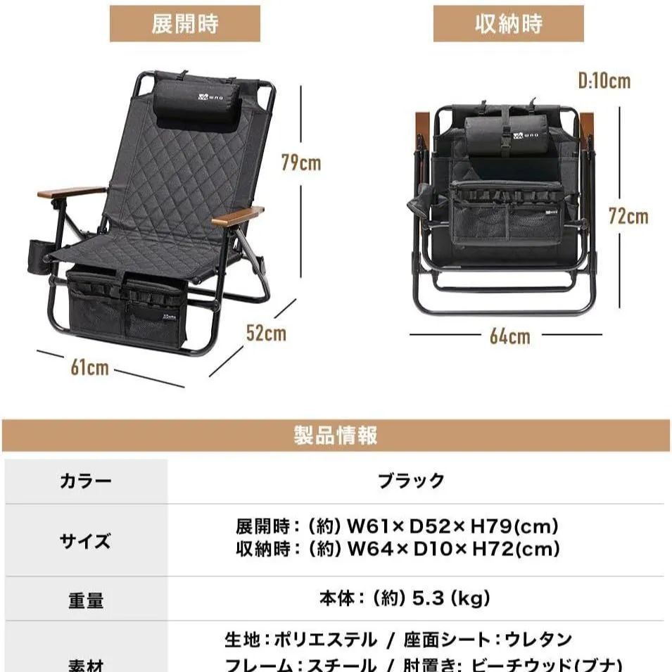 ・ドリンクホルダーが付属:ドリンクやスマホなど、手に届く範囲においておくことが可能です。・取り外し可能なヘッドレスト。頭を安定させるヘッドレストも標準装備。取り外しが可能です。・ウェビングループ付き:・かんたん設営:使用時は開くだけで設置できるかんたん設計です。