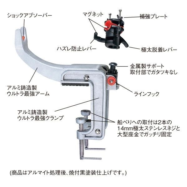 竿受アーム部分を大型リールでもラクに搭載できるように長さを約30cmに延長し、クランプと同じ高剛性なアルミ鋳造製に変更。
