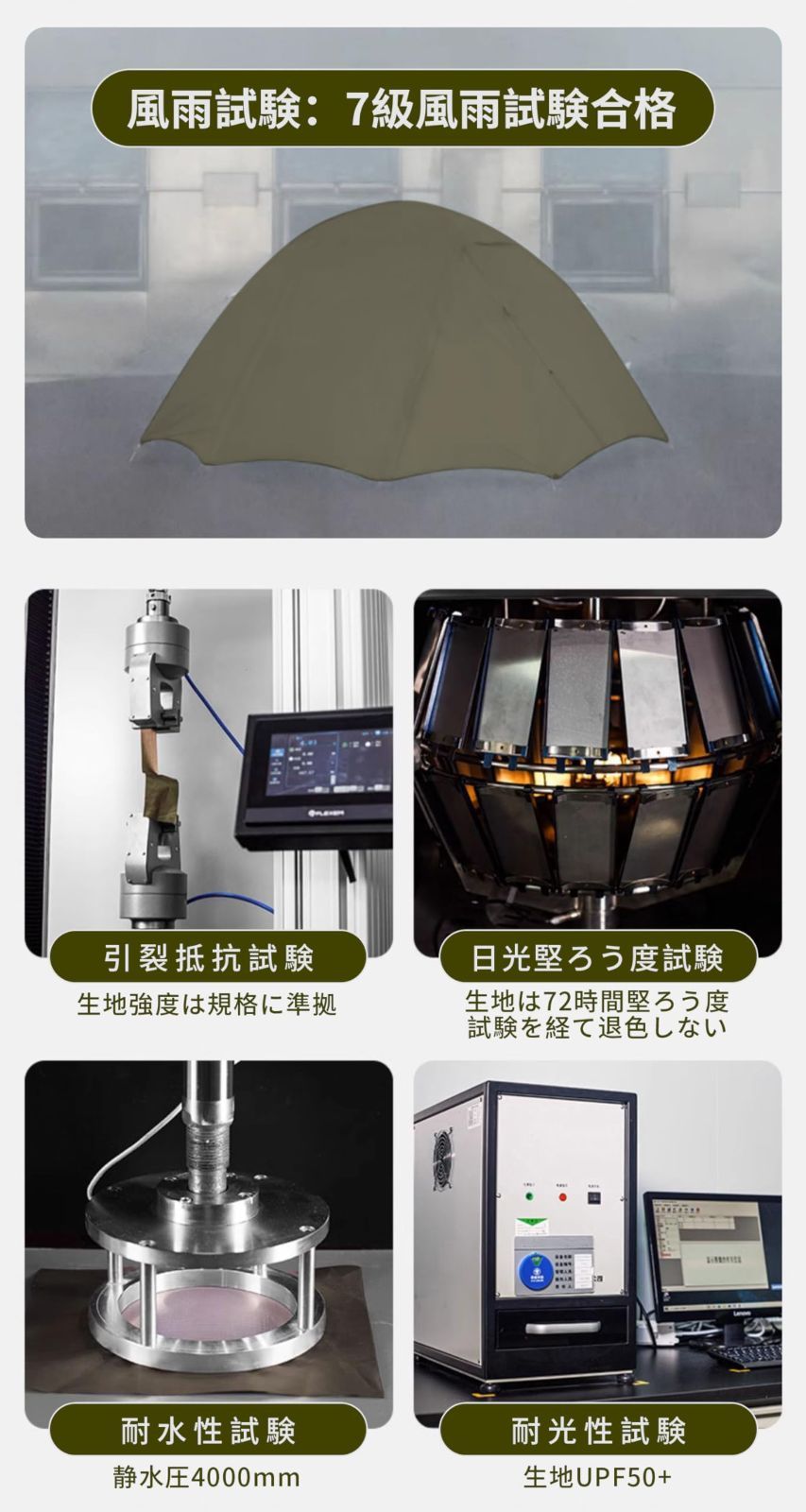 ?【こだわる機能満載】ダブルファスナー:開閉用のフロントシート、インナーメッシュはダブルファスナーが付いていますので、内外両側から簡単に開け閉めができます。 ?ランタンフック:寝室部分にランタンフックを配置して、夜間のテントライフをより快適にします。またキャンプやツーリングの細々とした道具・装備を吊るすことも可能です。 ?【虫の侵入なし】インナーテントのメッシュの網目は、風通しを確保しつつも虫が入ってこられないちょうどよい細かさに設計されています。蚊帳としての役割も十二分に果たします。