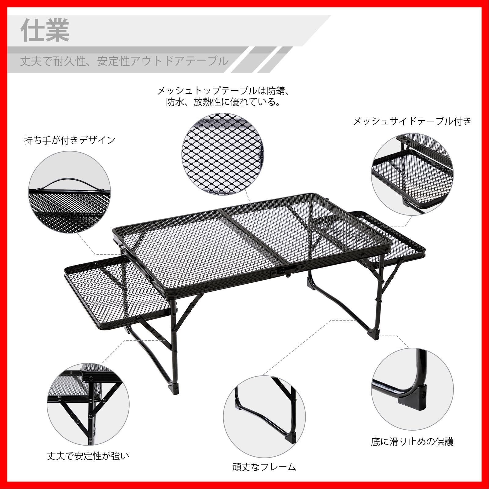 【多機能・1台多役】:以前のキャンプテーブルよりも、スペースを増やすために両側に2つの小さなサイドテーブルを追加しました。サイドテーブルの耐荷重は約5kgでもっと小物収納にも便利です。キャンプテーブル、物置テーブル、アウトドア調理台、水切り台、サイドテーブル、クーラーボックス置き場など色々場合にも適応します。