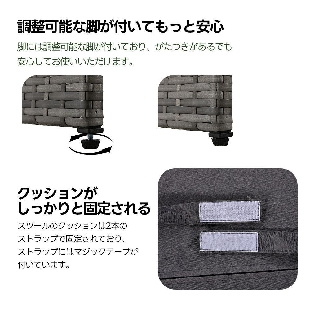 テーブルの4脚や椅子の後ろ2脚には、がたつきを防ぐアジャスターが装備されており、屋外やバルコニーのわずかに不平な地面にも調整して、どんな場所でも快適で安定感のある座り心地をお楽しみいただけます。
