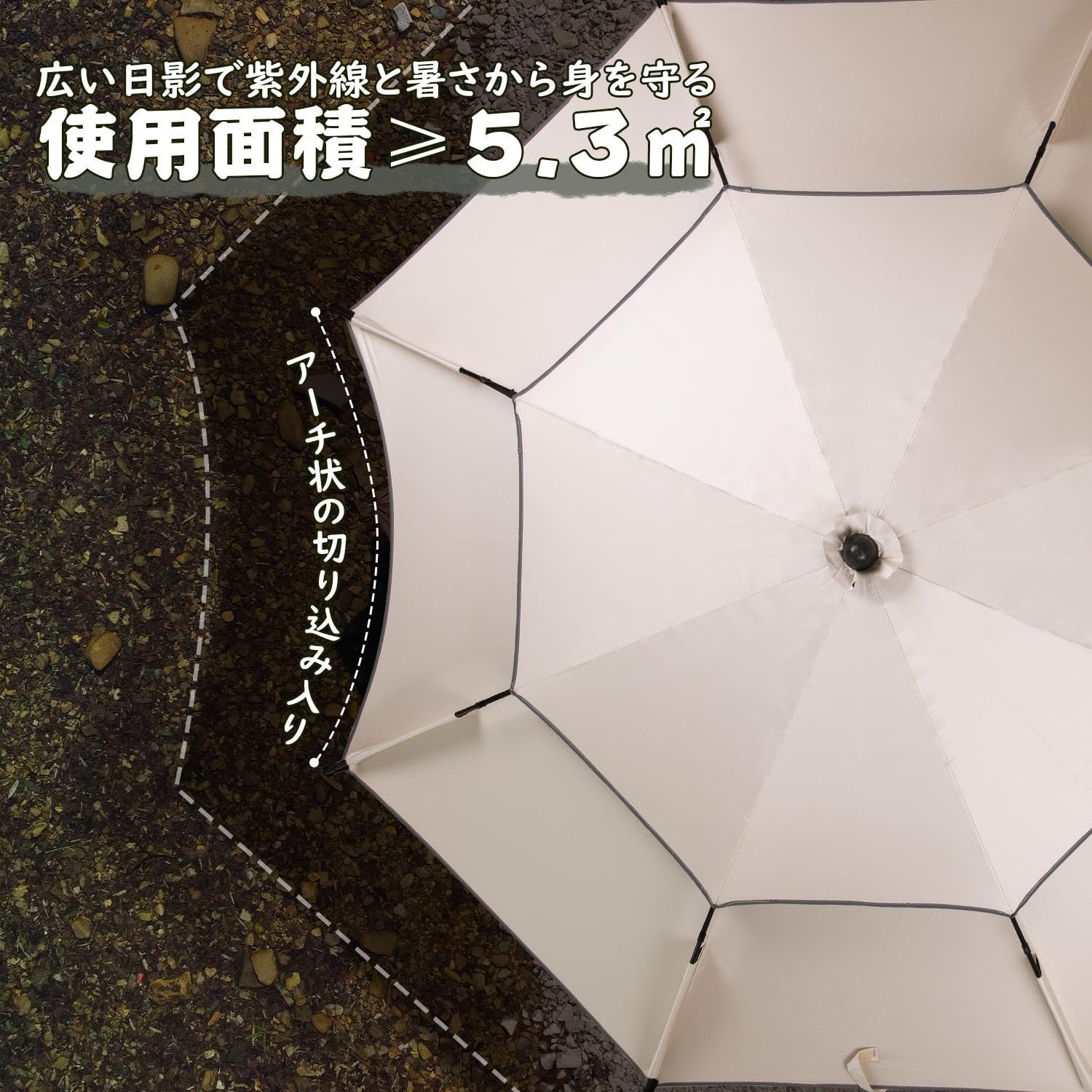 強風に強い設計:パラソルの上部には風抜きのベンチレーションも装備、パラソル内側にたまる空気が通り抜け、通気性が抜群な一方で、突然の強風による倒れる事故も防げます。直径約8mmの傘骨に三角安定設計法を使用し、さらに風に耐えられる強度と安定性を高めました。