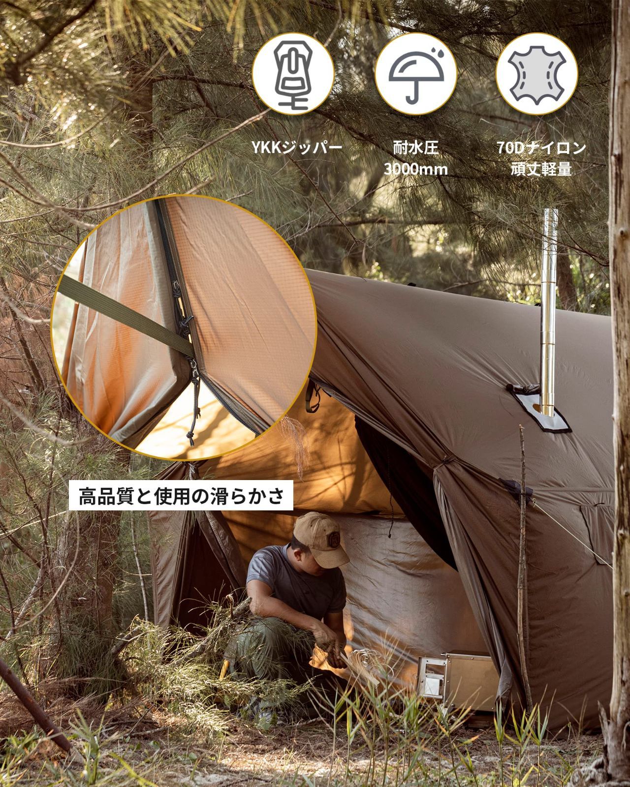 【多様なキャンプテント】テント内にハンモック設置ができ、アウトドアキャンプ中に風雨から守ることができます。 また、インナーテントだけではなく、キャンプ用コットも使用でき、装備に応じて変えることができます。 薪ストーブ使用可能、煙突穴2つあり、煙の向きを煙突で調整でき、寒冷地でも暖かくキャンプを楽しめます。スカートも付いているので寒さ対策にもなります。
