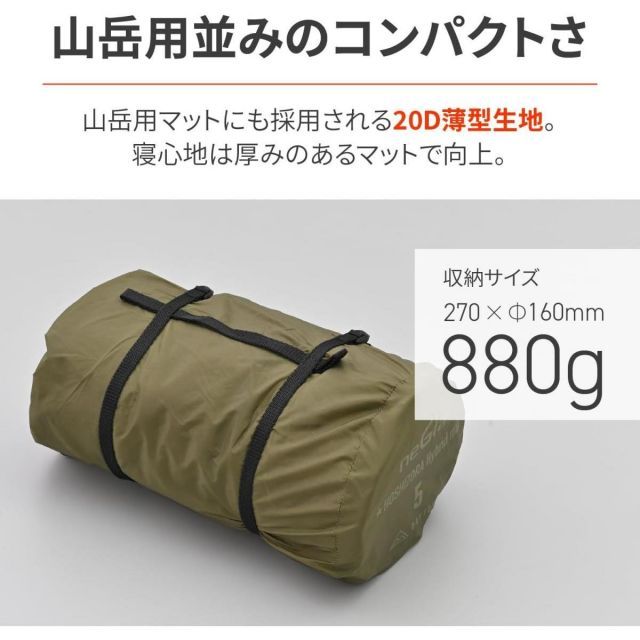 山岳用マットにも使用される薄型の20Dリップストップナイロンを採用。重量は約880g。