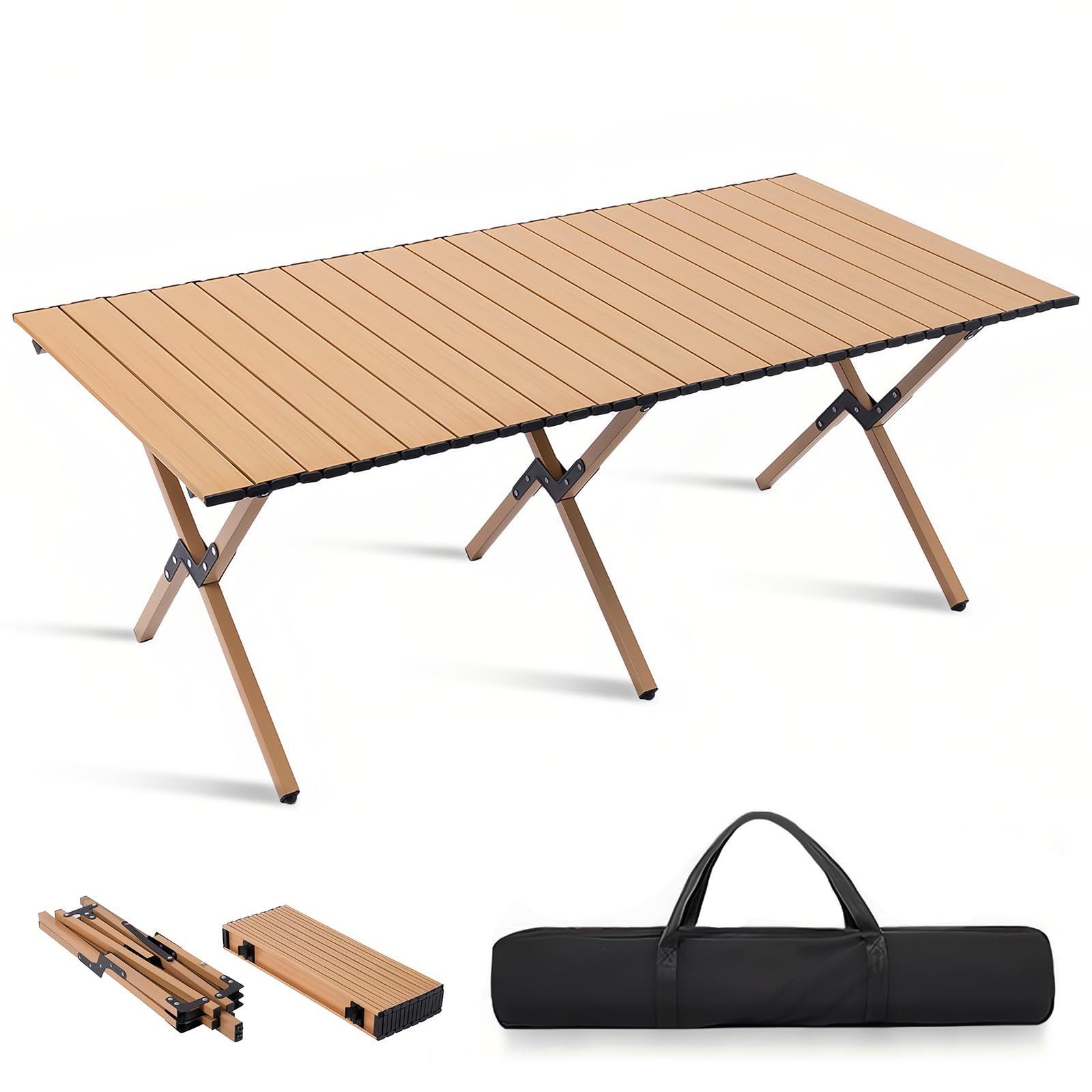 アルミ合金製のキャンプテーブル:キャンプテーブルは黄色い木目のテーブルのような外観ですが、全体はアルミ合金製で、防水性、耐火性、防錆性に優れているだけでなく、非常に丈夫で耐久性があるので、耐久性を心配する必要はありません。