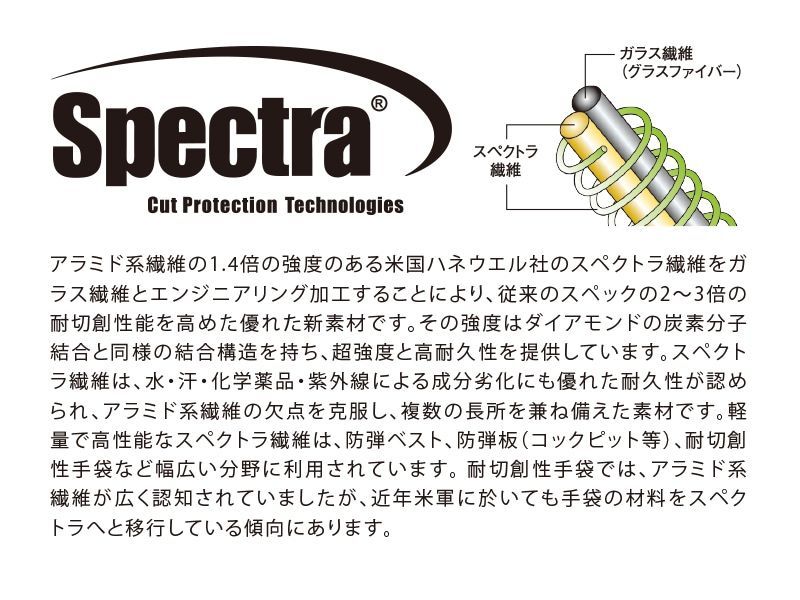 スペクトラガードCXで作られた製品は、アラミド繊維で作られた製品に比べて2倍のカット抵抗があります。スペクトラガードCXは現在の最新技術である防弾ベストの材料であるスペクトラ繊維も含んでおります。