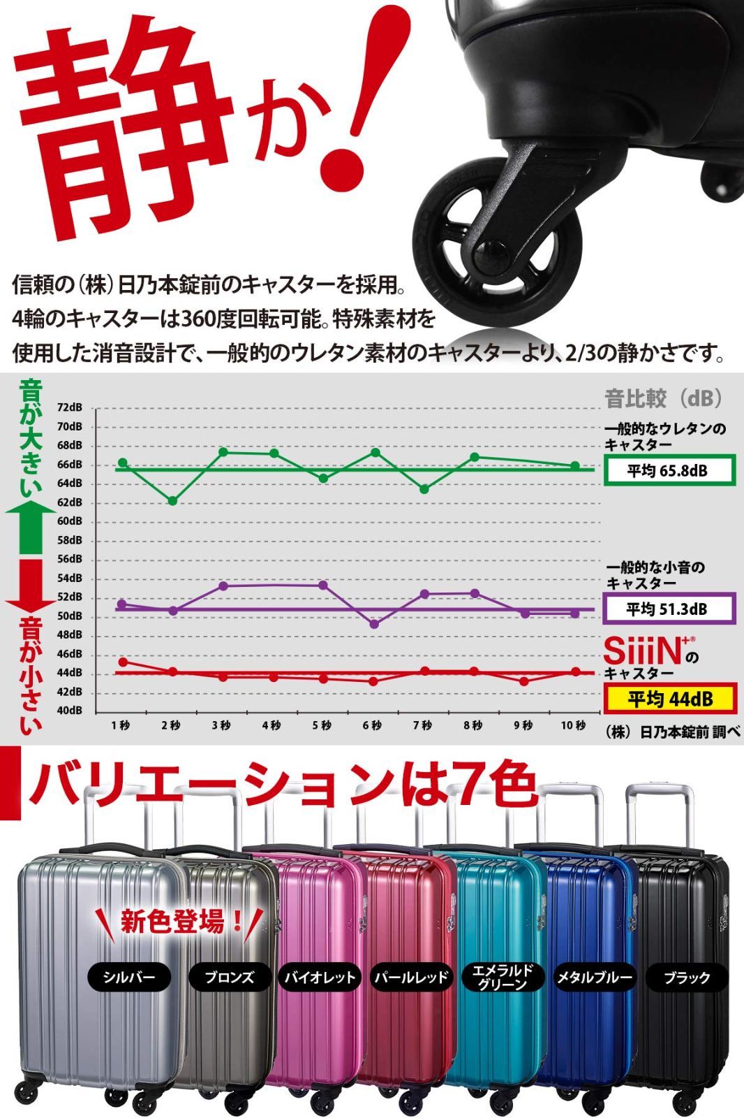 【とても静かなハードスーツケース!】 4輪のキャスターは、360度回転可能です。 特殊素材を使用した静音設計で、使い心地がいいです。 【一般的なウレタンのキャスターの音より、約2/3の音の大きさで静か】 一般的なウレタンのキャスターは、平均65.8dB 一般的な少音のキャスターは、平均51.3dB SiiiN+のキャスターは、平均44dBです。