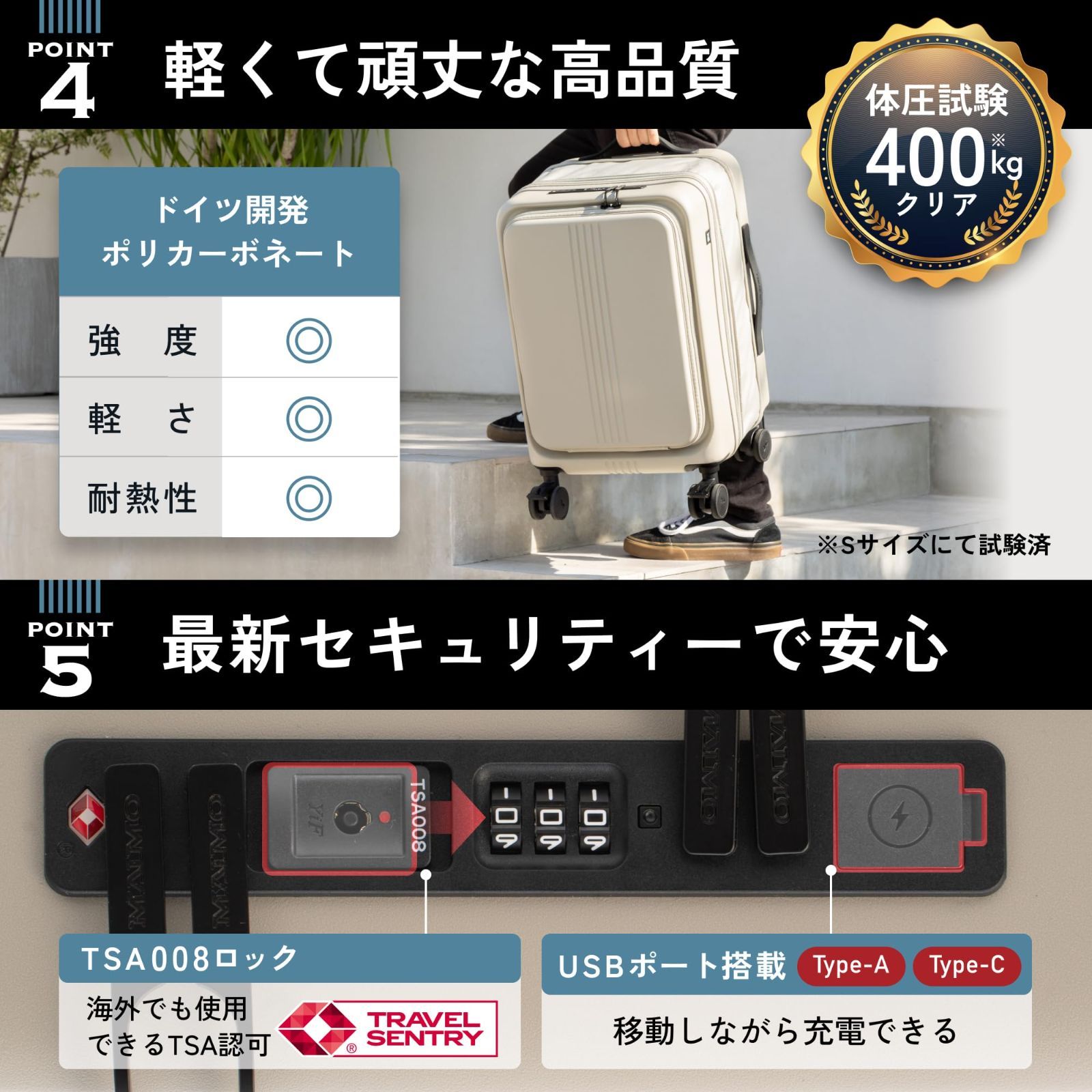 ✅【USBポート2口付きTSAロック・多段階キャリーバー】最新セキュリティーのTSA008モデルを採用。暗証番号タイプなので、鍵の紛失のリスクがありません。USBポート(Type-A、Type-C)搭載で、モバイルバッテリーを入れたまま充電可能。キャリーバーは使用シーンや身長に合わせて、お好みの高さで1cm単位で調整可能。※USB2.0、最大24W(12V/2A)まで ※USB Power-Delivery(USB-PD)には対応しておりません。