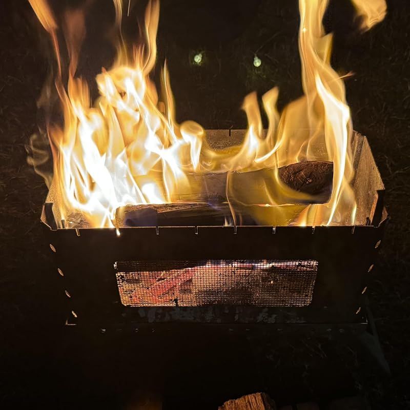 【高い燃焼性】本体の前面に大きなメッシュ窓があり、火の粉が飛び散ることを防ぎ空気を取り込み、燃焼効率を上げます。 メッシュ窓からゆらめく炎を見えてキャンプファイヤー感が楽しめます。ロストルはV型なので、長く燃え続けると熱変形することはありません。 ロストルにより灰受ができ、通風を良くして燃焼効率を高くします。