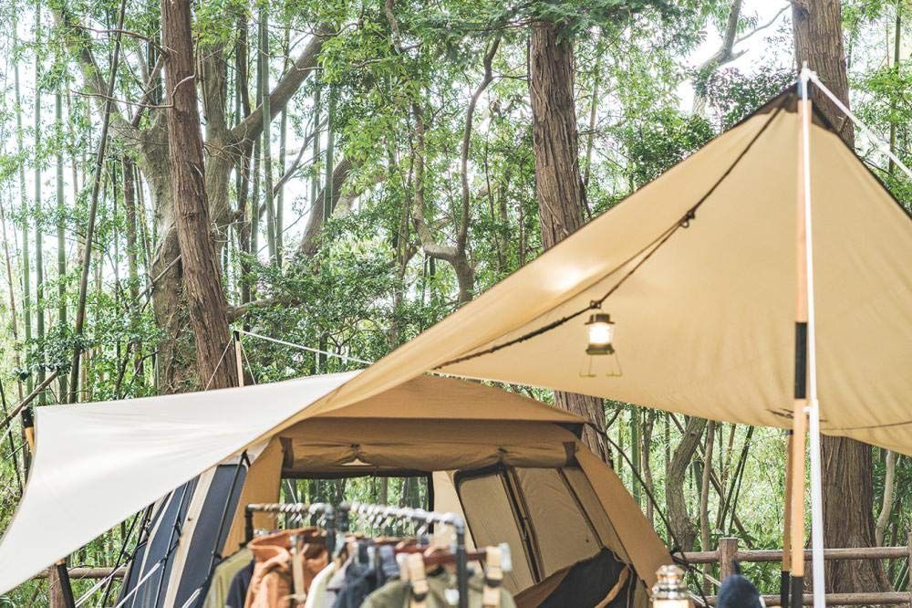 美しい曲線のヘキサタープが新色で登場。テントとの接続を容易にしたセッティングテープを付属。遮光コーティングと210dの生地厚な素材を使用。