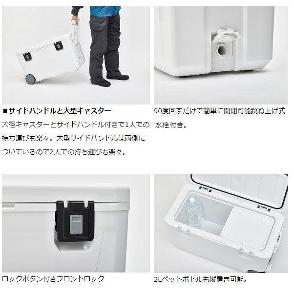 頑丈×楽々! DAIWA史上最もタフなクーラーが新登場!■堅牢×頑丈!タフボディ ■大径キャスターとサイドハンドル付きで1人での持ち運びも楽々 ■大型サイドハンドルは両側についているので2人での持ち運びも楽々 ■上フタをガッチリ密閉するロックボタン付きフロントロック。もちろん上フタは両開きで取り外し可なのでお手入れも簡単 ■90度回すだけで簡単に開閉可能、手も濡れない跳ね上げ式水栓付き ■容量43Lで中型から大型魚まで幅広く対応 ■2Lペットボトルも縦置き可能な背高仕様 ■滑り止めゴム脚付きで抜群の安定感 ■ウレタン断熱の高保冷モデルと軽量スチロールモデルをラインナップ ■クーラーにぴったりフィットする防水プルーフケース付属 ★ 断熱材:スチロール 自重:8.3kg 容量:43L 内寸:23×56.5×31.5cm 外寸:34×73.5×41cm 保冷力:KEEP84 ※実物と色が違って見える場合があります。あらかじめご了承下さい。