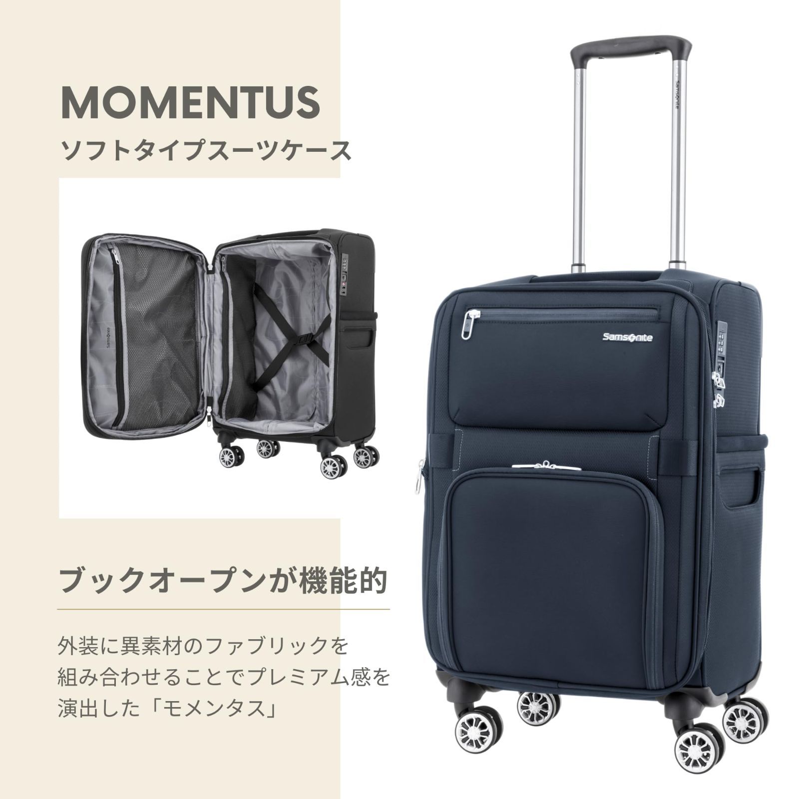 外装に異素材のファブリックを組み合わせることでプレミアム感を演出した「モメンタス」は、アクセントテープが配されカジュアル&スポーティな仕上がり。全サイズにエキスパンダブル(拡張)機能を搭載しており、旅先で荷物が増えても安心です。フロントには2つのポケットを装備しており、上ポケットには止水ジッパーを採用、下ポケットにはお手持ちの南京錠でロック可能なジッパーを採用しています。内装には小物の整理に便利なメッシュポケット、荷崩れを防ぐクロスストラップを装備。その他にもフラットなTSAロック、持ちやすいサイドハンドル、コーナープロテクション、快適な走行のダブルホイール、背面にキックガードを備えています。