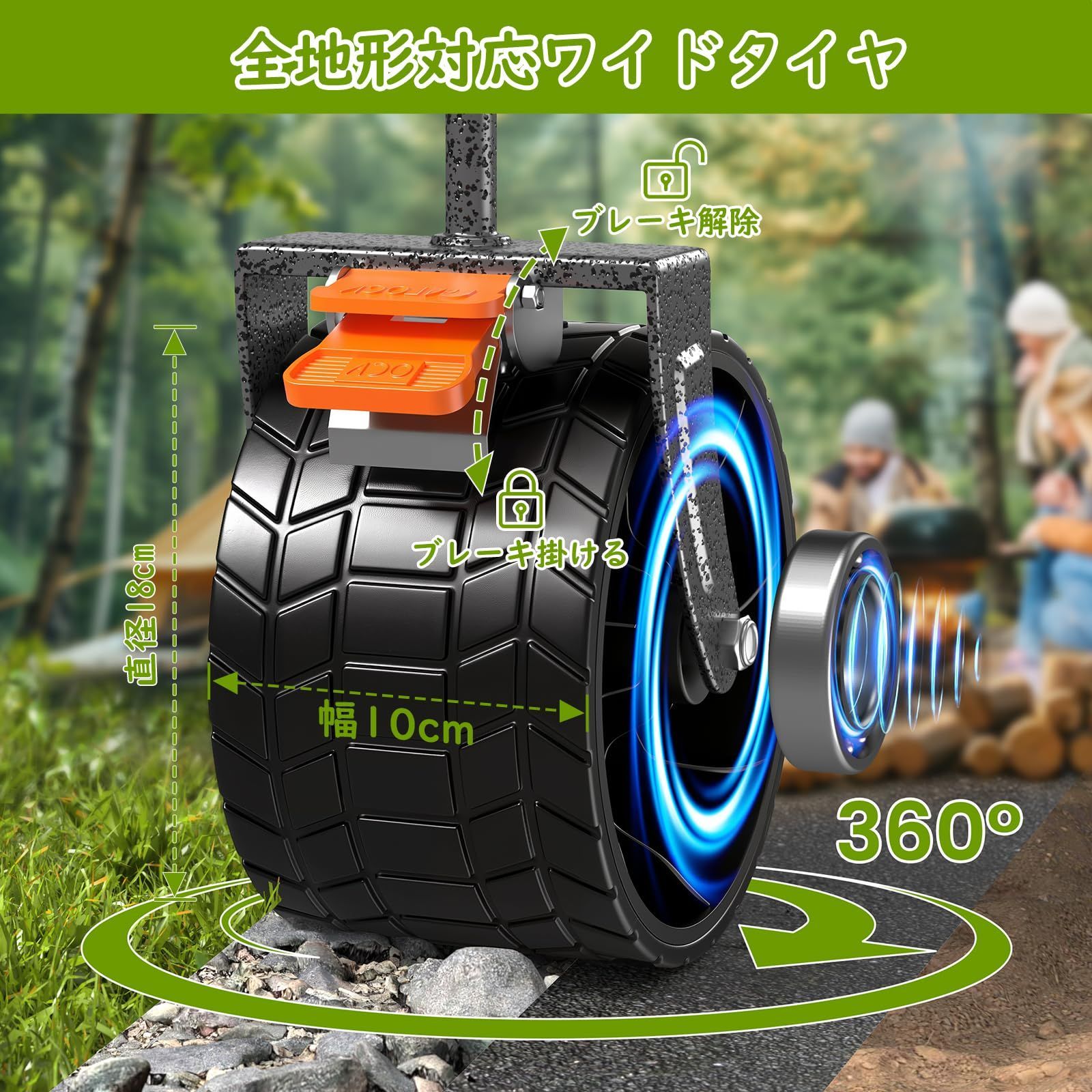 「安定に動かせるゴム製中型タイヤ」 音が静かでグリップ力も優れてた細すぎず大きすぎずのちょうど良いゴム製の中型タイヤを採用するため、凹凸がある道でも安定して動かすことができるうえ、山道、砂利道、砂浜などアウトドアの様々なシーンで活躍することに期待できます。ストッパーも前輪に搭載してあり、傾斜のある道でも停車しても転がらず、荷物の上げ下ろしが安定してスムーズに行えます。
