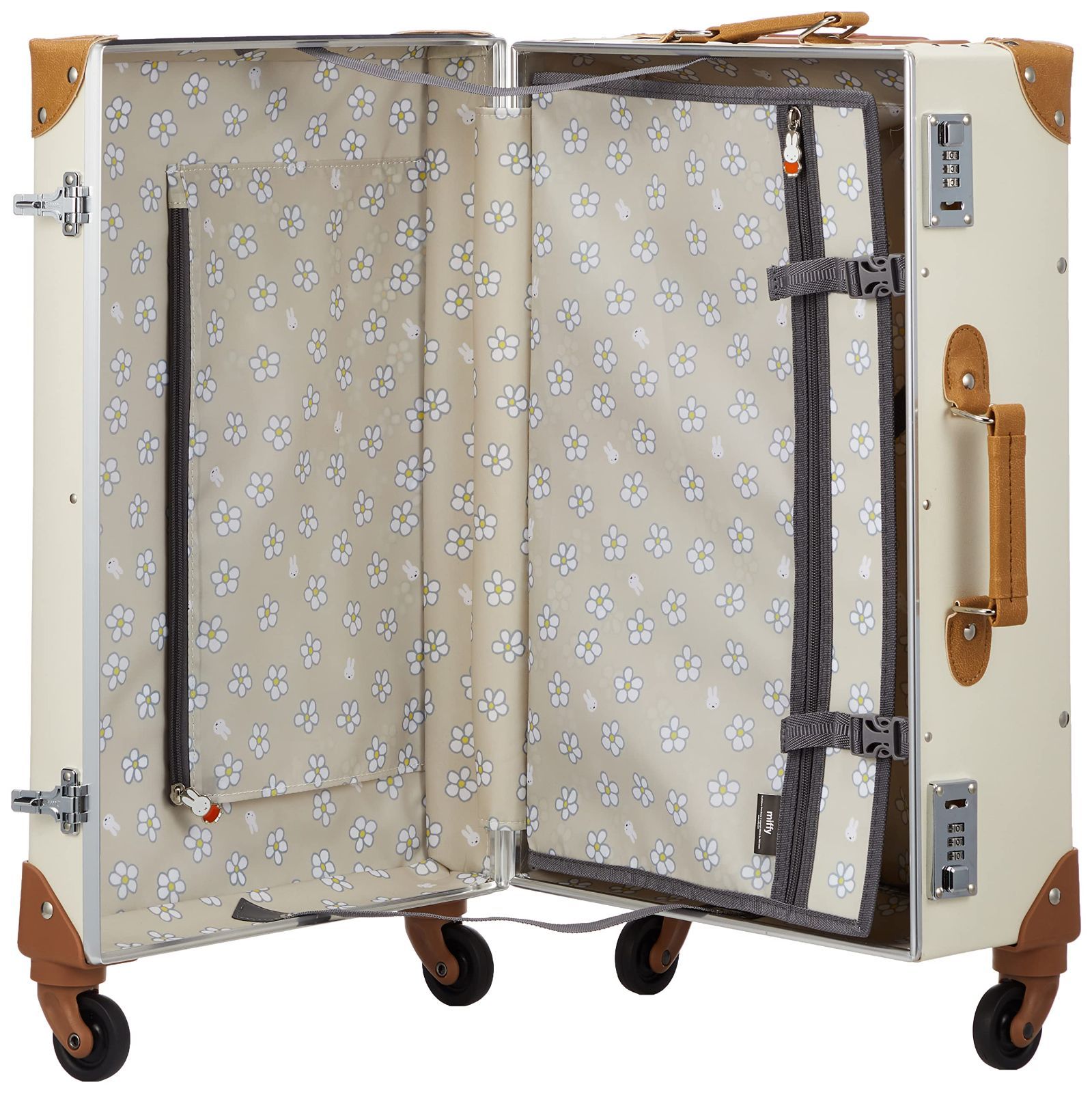 ミッフィーのかわいいフェイスのトランクキャリー。合成皮革で作られておりクラシカルでおしゃれな雰囲気。内装生地にはかわいいミッフィーの花柄をプリント。内装のファスナートップもミッフィーの形で、細部までこだわった作りです。