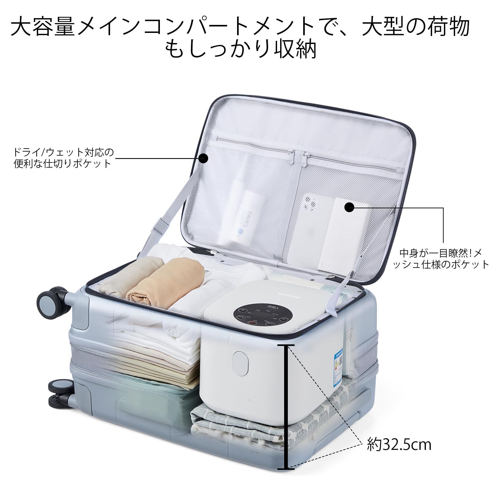 【片開き設計】 従来の開き方を破り、片開きがより簡単になりました。荷物を開けたときの占有スペースを減らすことができます。