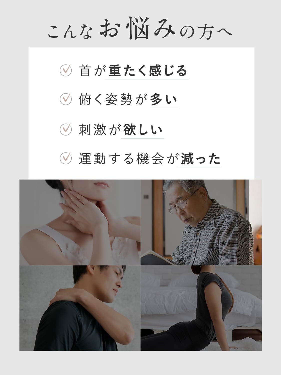 じんわり温感ケア 押圧されながら広がる温熱で首元リラックス。じんわり芯から温まり、首まわりをケアします。2段階の温度調節が可能で、その日の気分に合わせてお好みの温度でご利用いただけます。(※温熱機能は単独でも使用可能です。)