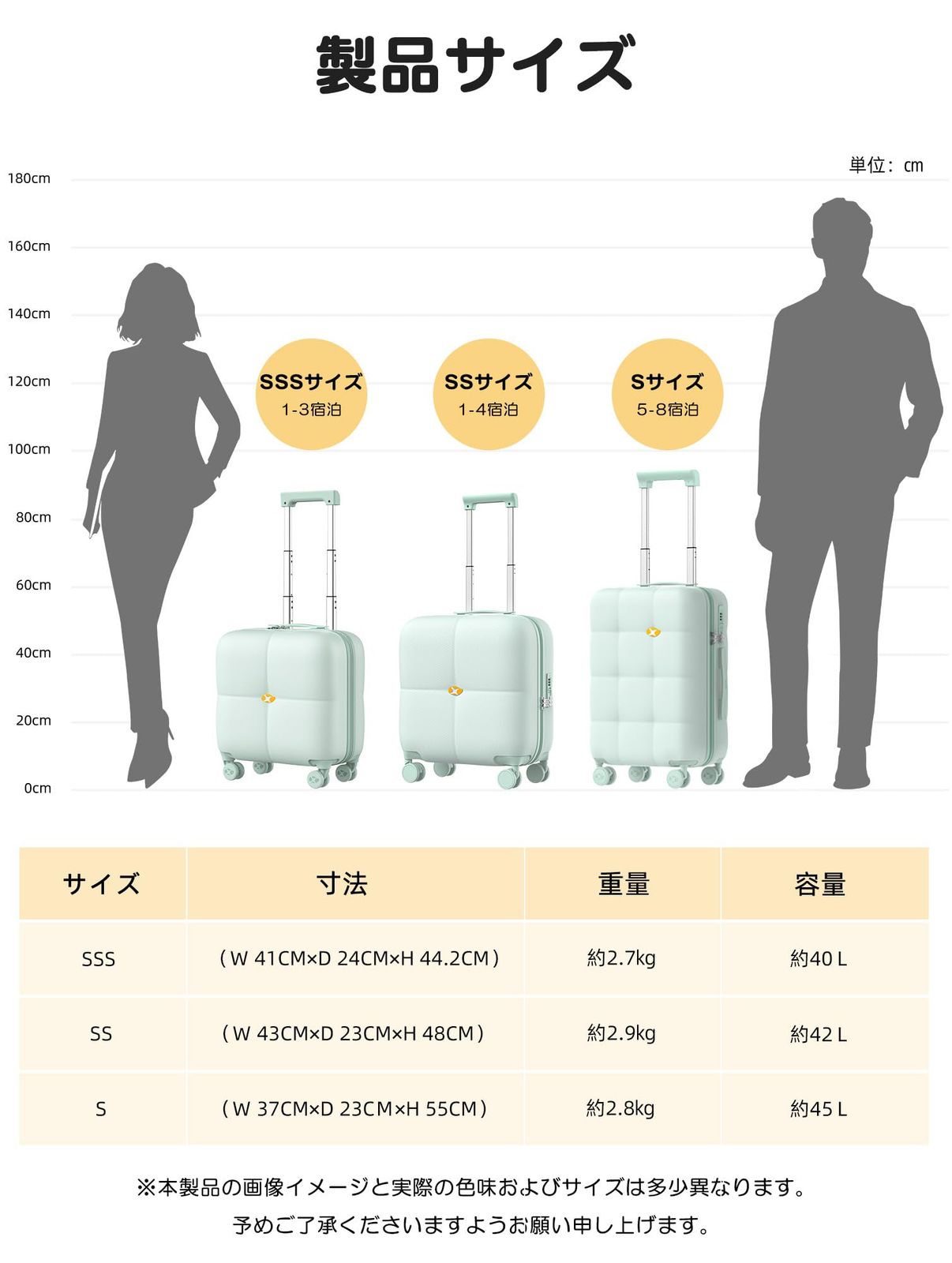 【商品仕様】※【SSサイズ】43×23×48cm、三辺合計:114cm、 本体重量:約2.9KG 、容量:42L/1~3泊向き。 ※【Sサイズ】37×23×55cm、三辺合計:115cm、 本体重量:約2.8KG 、容量:45L/1~4泊向き。Sサイズは機内持込が可能なスーツケースです。飛行機内だけでなく、一人旅行や故郷帰りの新幹線やバスなどの車内移動も便利なスーツケースです。※【Mサイズ】47×27×67cm、本体重量:約3.7KG 、容量:80L/5~10泊向き、無料受託可能(158cm以下)**測定方法により2-3cmの誤差がありますので、予めご了承ください。