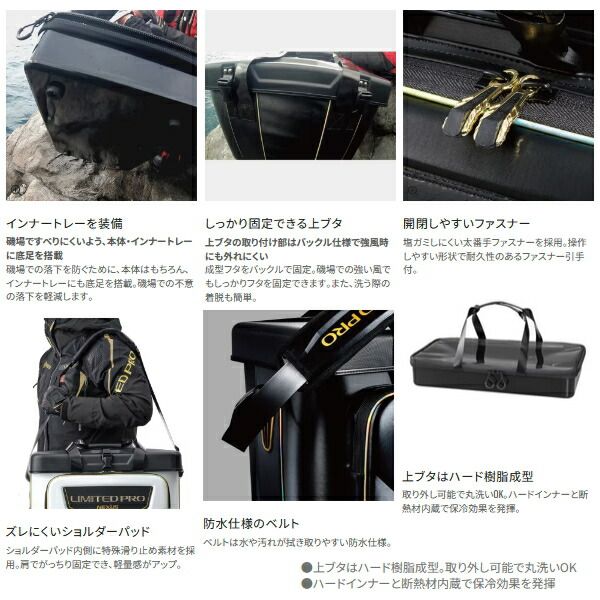 ◆遠征時の渡船で、荷室に積み重ねられたときでも安心して運搬ができる本体構造を採用。過酷な磯場でしっかり使い込めるリミテッドプロ磯バッグ。