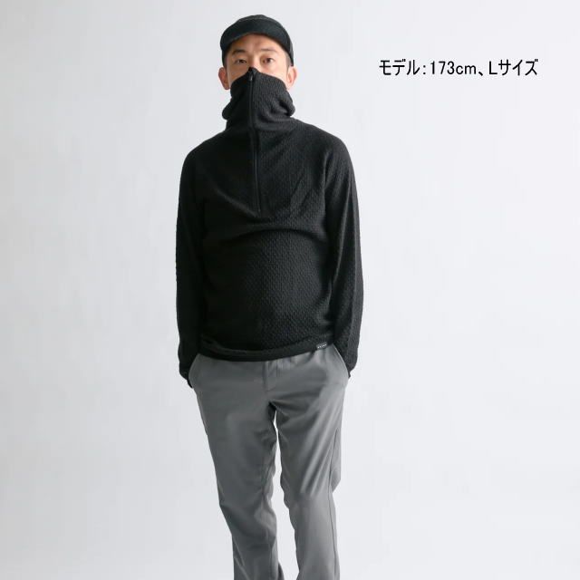 顔まで覆うバラクラバスタイルのフードを備えているので、首周りの防寒性も高く、特徴的な凸凹した表面感は、体温を衣類の中にしっかりとキープします。また縫い目がないので素肌に着てもゴロつきにくく、素肌の上に着た時に最高の機能を発揮します。