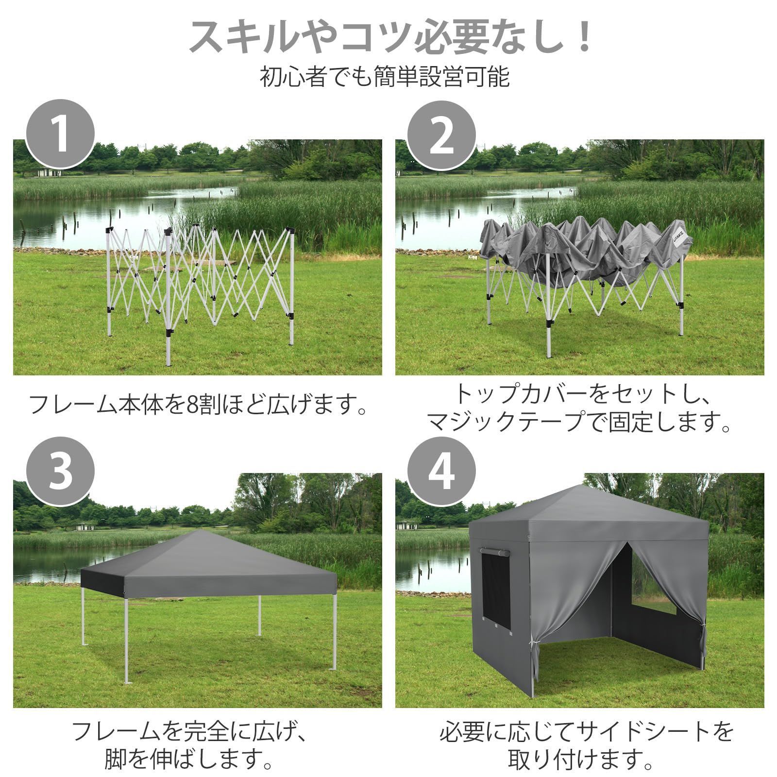 Litake ワンタッチタープテント 3 mx m アップグレード キャノピーポール付き 3段階調節 UVカット 日よけ 高耐水 組立簡単 天幕 サイドシート 付 キャンプ テント アウトドア グレー