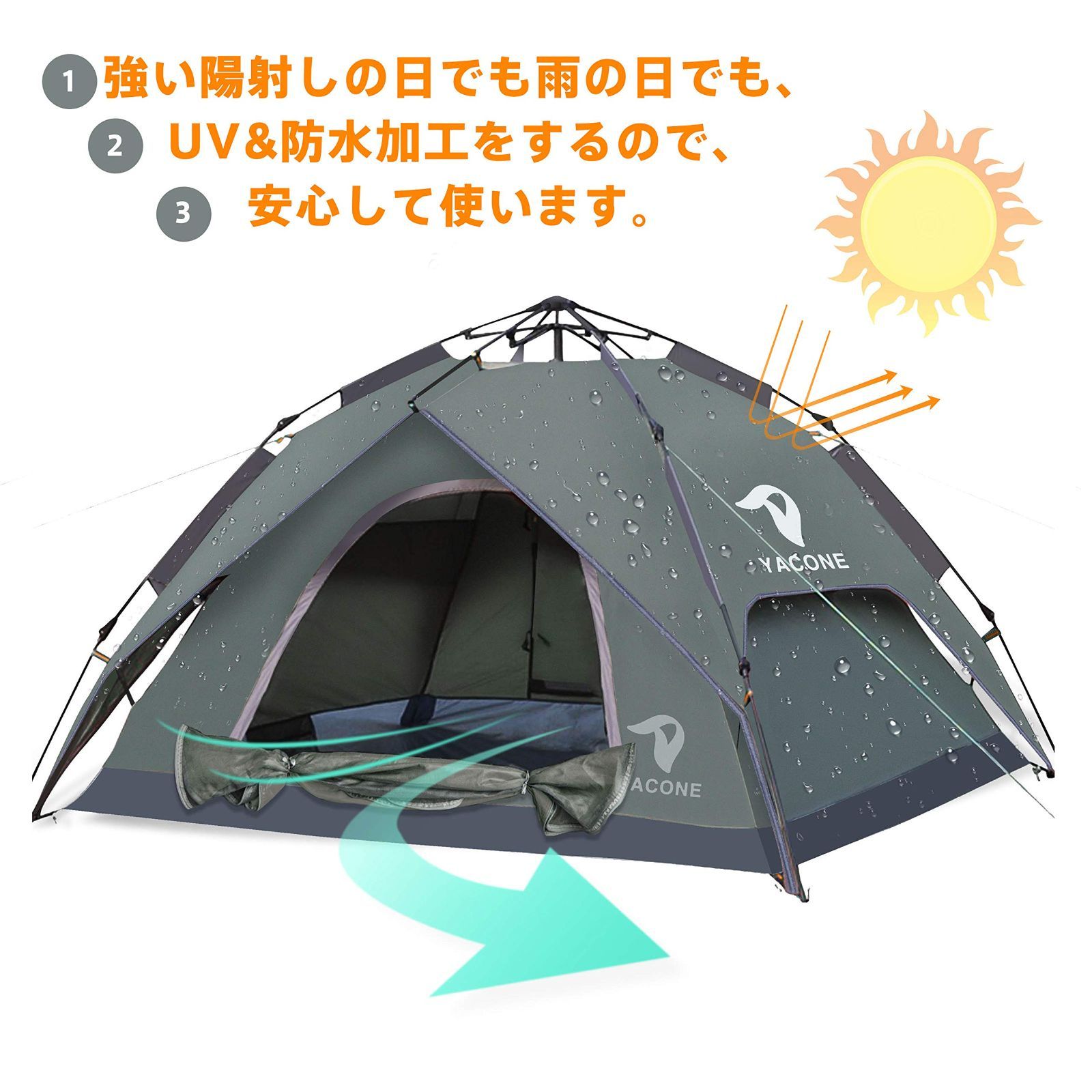 耐水圧3000 mm 防災用 防風 アウトドア キャンプ ワンタッチ uvカット加工 設営簡単 二重層 テント 2 WAY 3~4人用 ワンタッチテント YACONE