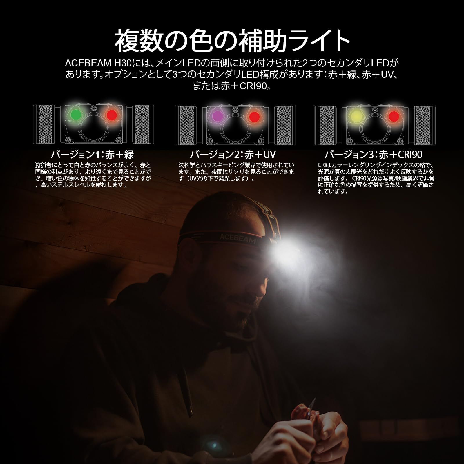 ACEBEAM H30 LED ヘッドライト 明るい 4000ルーメン/USB-C充電式 /3種類の光源/実用点灯200時間/IP68防水 ヘッドランプ ヘルメット 釣り 登山 防災 作業用 アウトドア用 頭につける ライト (昼白色5000K+赤+緑)