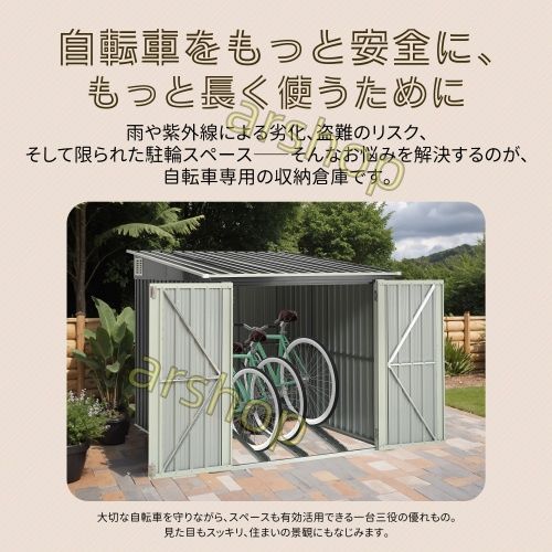 ◎01【自転車をもっと安全に、もっと長く使うために】雨や紫外線による劣化、盗難のリスク、そして限られた駐輪スペース――そんなお悩みを解決するのが、自転車専用の収納倉庫です。大切な自転車を守りながら、スペースも有効活用できる一台三役の優れもの。見た目もスッキリ、住まいの景観にもなじみます。