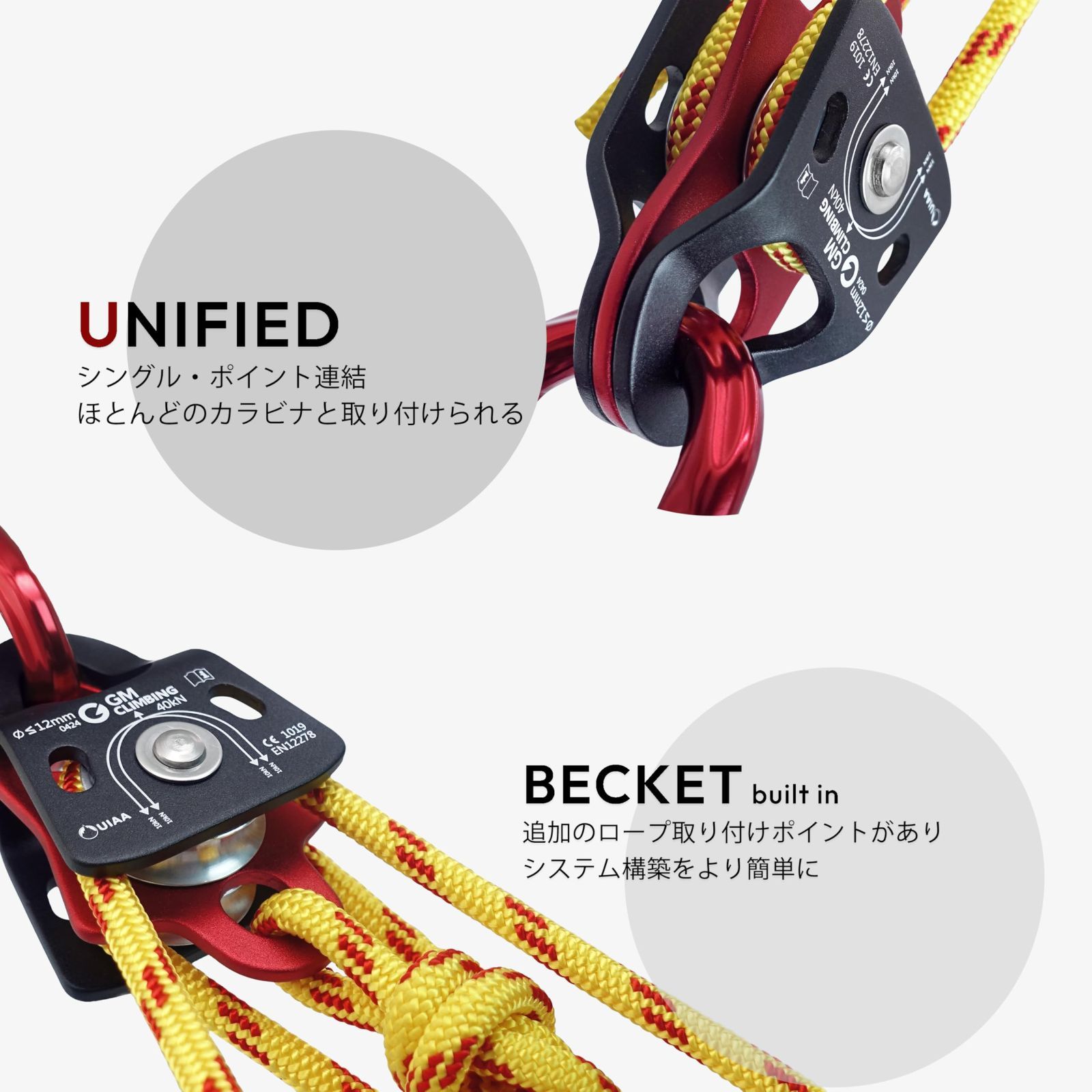 GM CLIMBINGの40kNマイクロダブルプーリーは、超コンパクトに製造され、軽量で耐久性に優れ、CEおよびUIAAにより認証済み、クライミング、レスキュー、倍力システム、リギングなど多目的に使用できます。