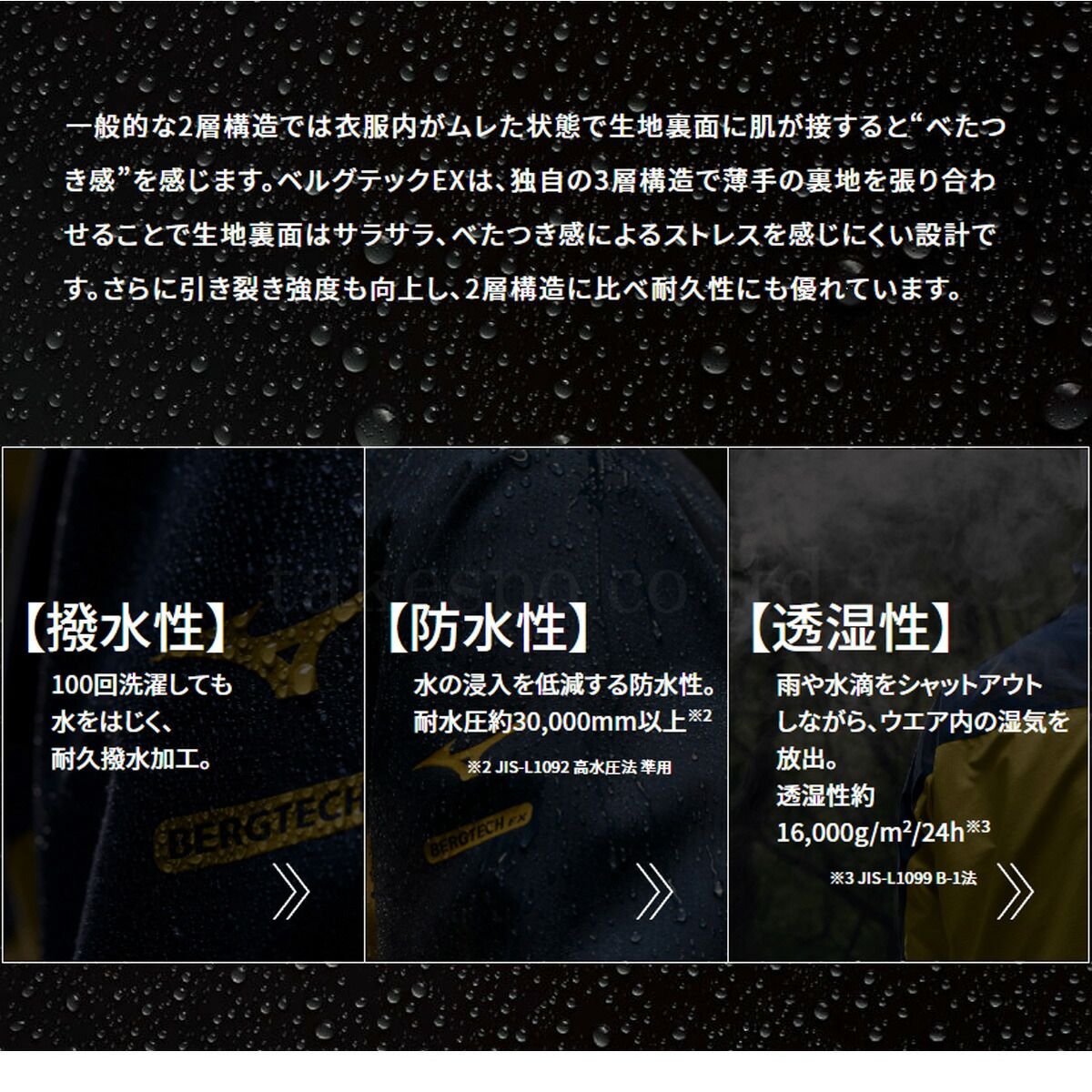 ■耐水圧30,000mm以上、透湿性約16,000g/m2-24h