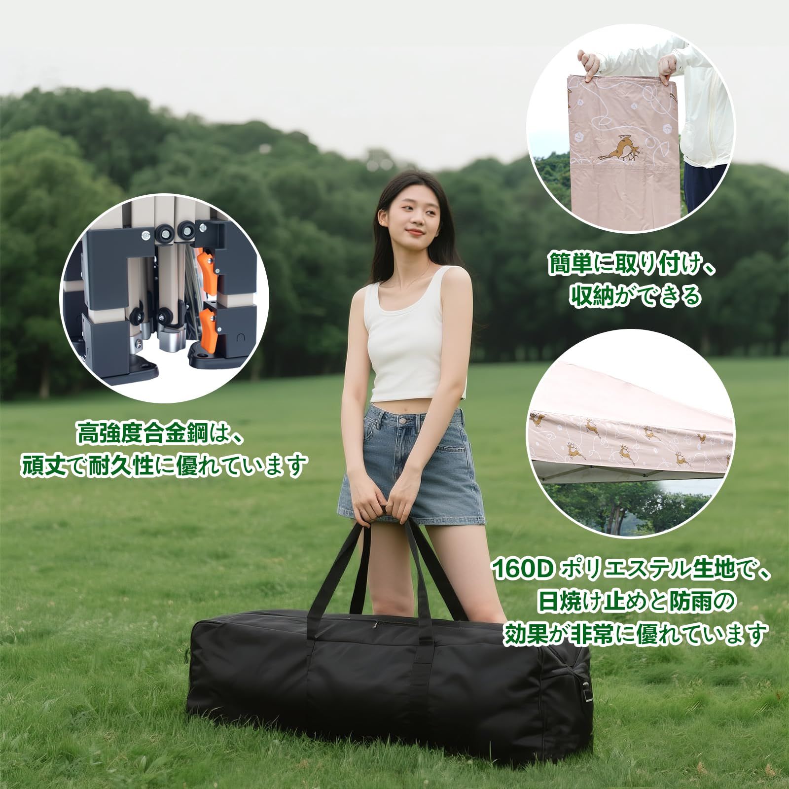 【簡単な組み立て設計】テントは折りたたみ/展開式の構造設計が採用されており、補助工具は不要で、2人で2分以内に簡単に組み立て/収納を完了することができます。「時間が急ぐ」場面、例えば市場での露店、臨時の雨避けなどに適しています。スタンドにはクイック調節ボタンが装備されており、3段階の高さ調節に対応し、さまざまな地形やニーズに柔軟に適応できます。