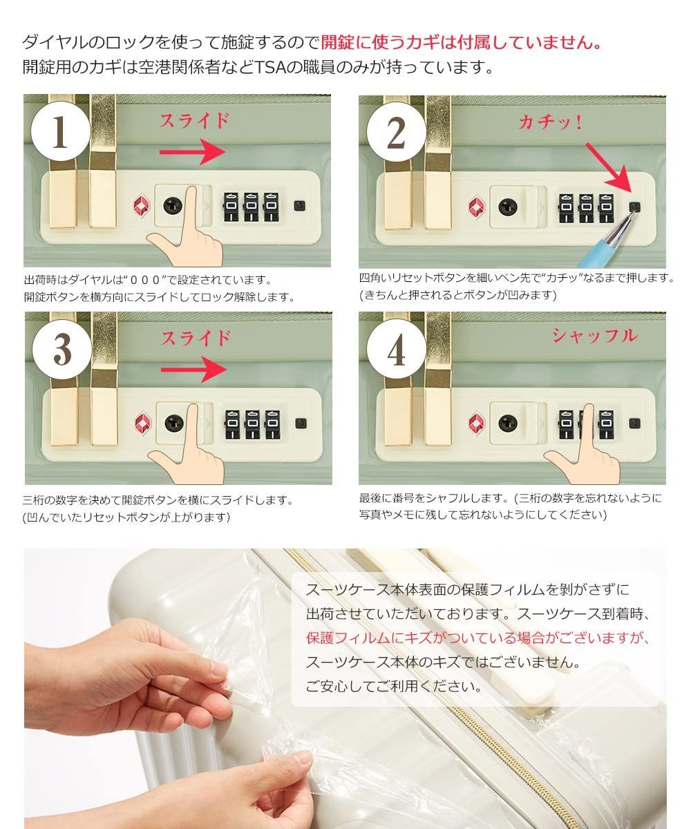 【超軽量・ハードタイプ・TSAロック搭載】このスーツケースは、超軽量なファスナータイプであり、ポリカーボネート+ABS樹脂の素材を採用しています。この素材は軽量かつ耐衝撃性に優れており、安心してお使いいただけます。さらに、TSAロックが搭載されており、施錠したまま荷物を預けることができます。ダイヤル式ロックなので、鍵をなくす心配もありません。