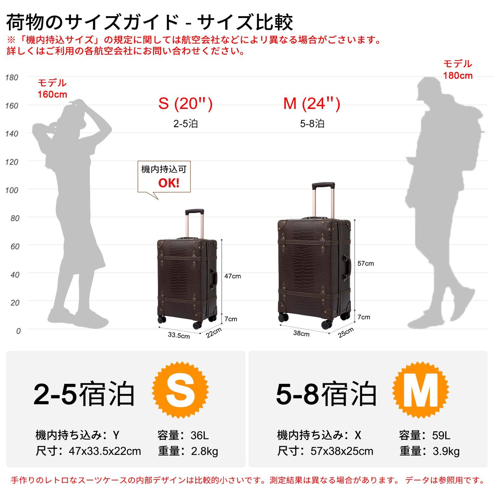 S(20inch)型(機内持ち込み可能) タテ47(ハンドル/キャスター部分含む)×ヨコ33.5×マチ22cm 36L(2~5泊用) 2.8kg。M(24inch)型 タテ57(ハンドル/キャスター部分含む)×ヨコ38×マチ25cm 59L(5~8泊用) 3.9kg。