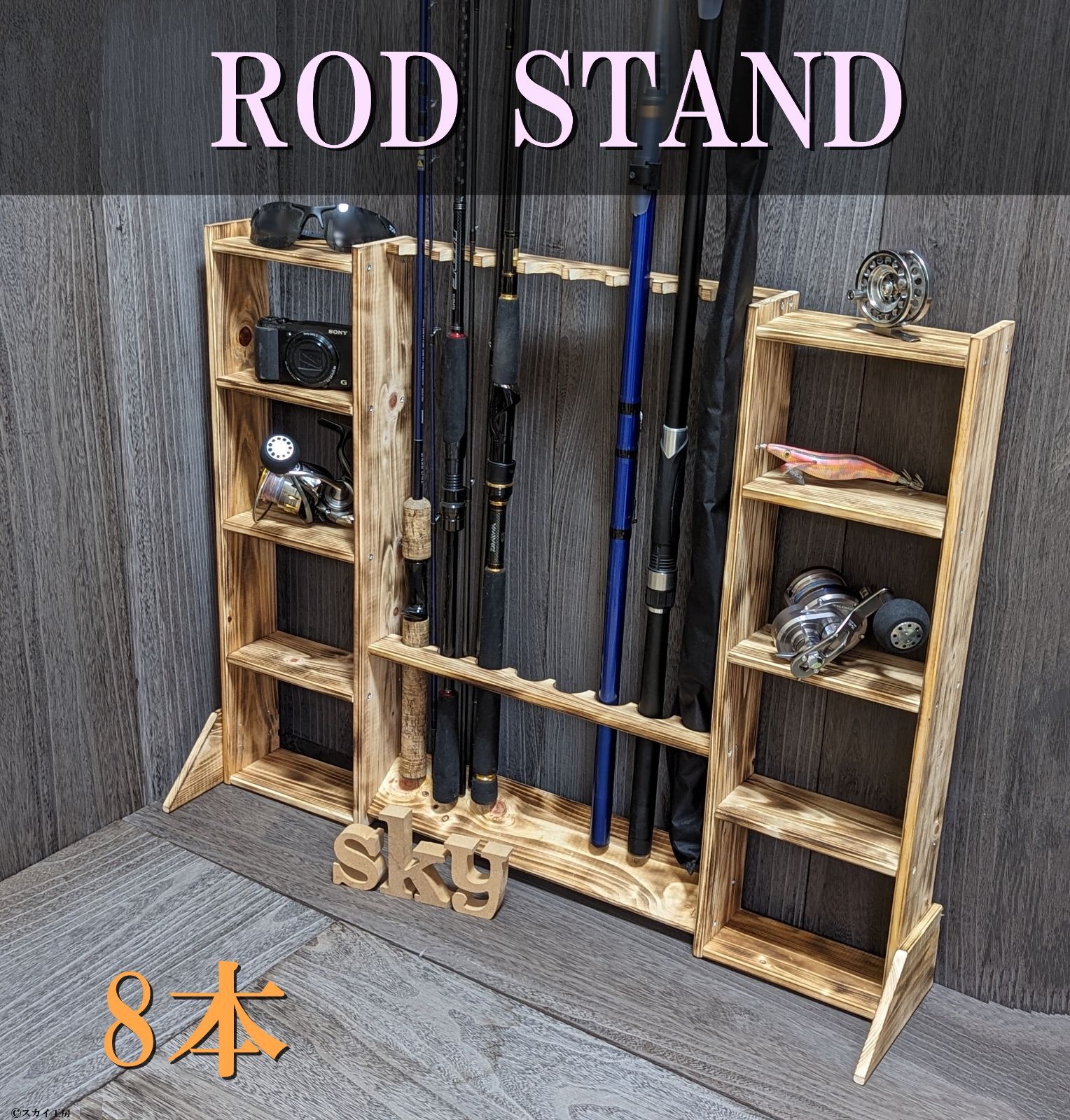 ロッドスタンド 8本 炙り加工 小物置き両側10段 国産ヒノキ製 完成品