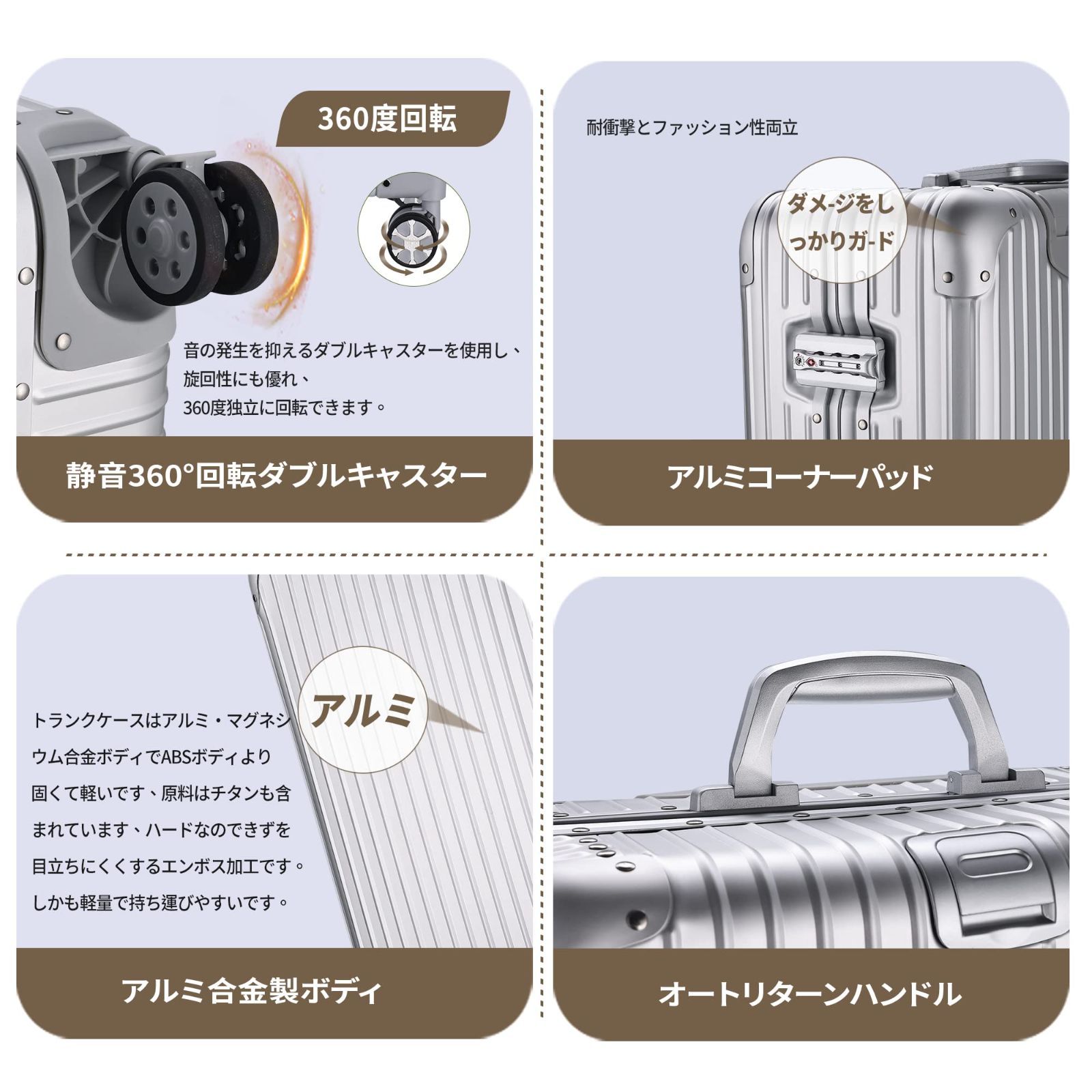 【全アルミニウム合金ボディ+アルミニウムフレーム】 このキャリーオンラゲージは、全アルミニウム合金ボディとアルミニウムフレームを備えており、洗練されたクールな外観を持っています。金属素材により強度と耐久性が確保され、長寿命を実現しています。金属のボディが高級感を演出し、優れた選択肢となります。