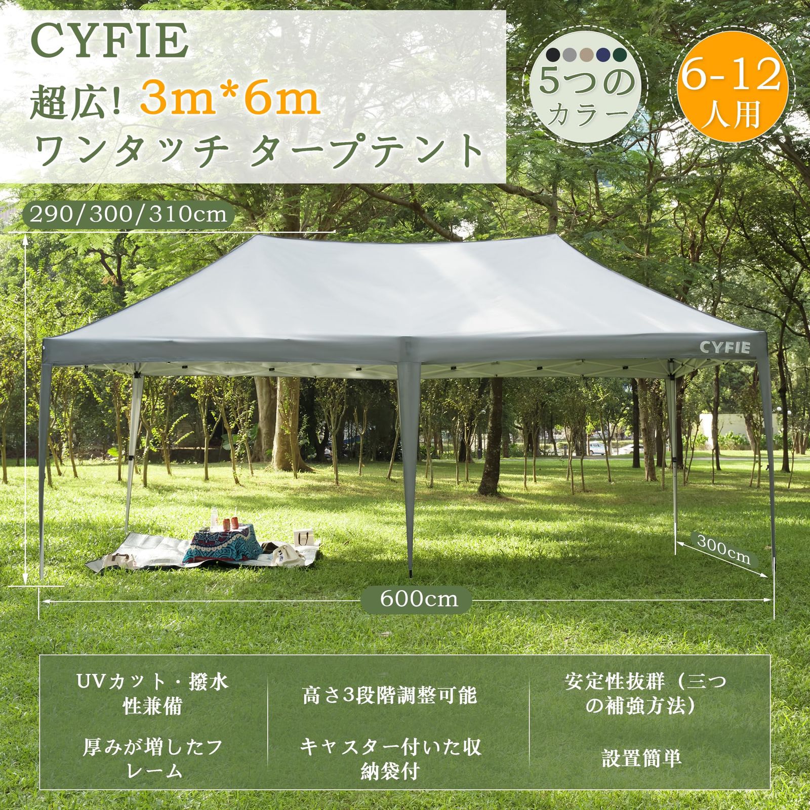 CYFIE タープテント 3mx6m ワンタッチタープ 高さ3段階調節 イベントテント テント ワンタッチ uvカットコーティング 高耐水加工 ワンタッチテント 組立て簡単 持ち運び便利 防災砂袋・ペグ・ロープ・キャスターある収納ケース付 ワンタッチタープテント アウトドア キャンプ 運動会 祭り用