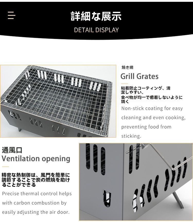 このポータブルバーベキュー炉は、煎焼き両用の便利なグリルです。コンパクトなデザインで、テーブル型のため、アウトドアや家庭で手軽に使用できます。焼肉だけでなく、煎料理も楽しめるので、一台で多彩な料理を作ることができます。キャンプやピクニック、庭でのバーベキューに最適なアイテムです。