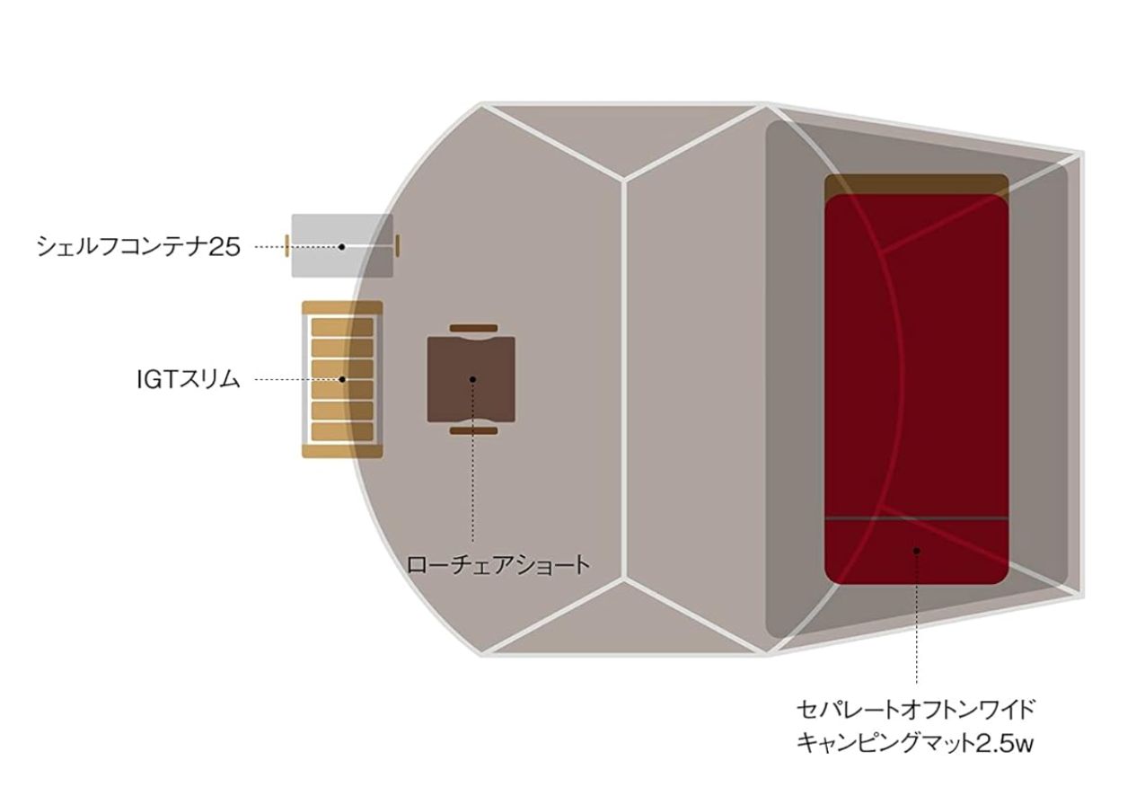ランドネストドームMを2ルームシェルターとして使用。悪天候時もOKなスタイルです。大人1人にちょうどいい広さで、ゆとりのあるレイアウトが可能です。