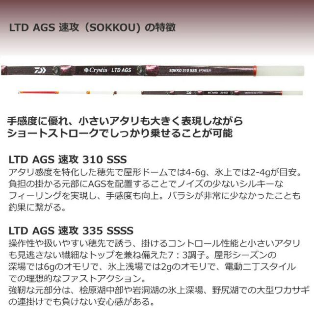 ショートバイトの多発するハイプレッシャーな屋形ドームやテントの乱立する氷上テントで間違いなく釣果アップの一手となる、小さいアタリも大きく表現しながらショートストロークでしっかり乗せることが可能な【アタリ感度】に特化した「AGS速攻310SSS」に対し、この「AGS速攻335SSSS」は【操作性や扱いやすさ】を追求したモデルに仕上げました。