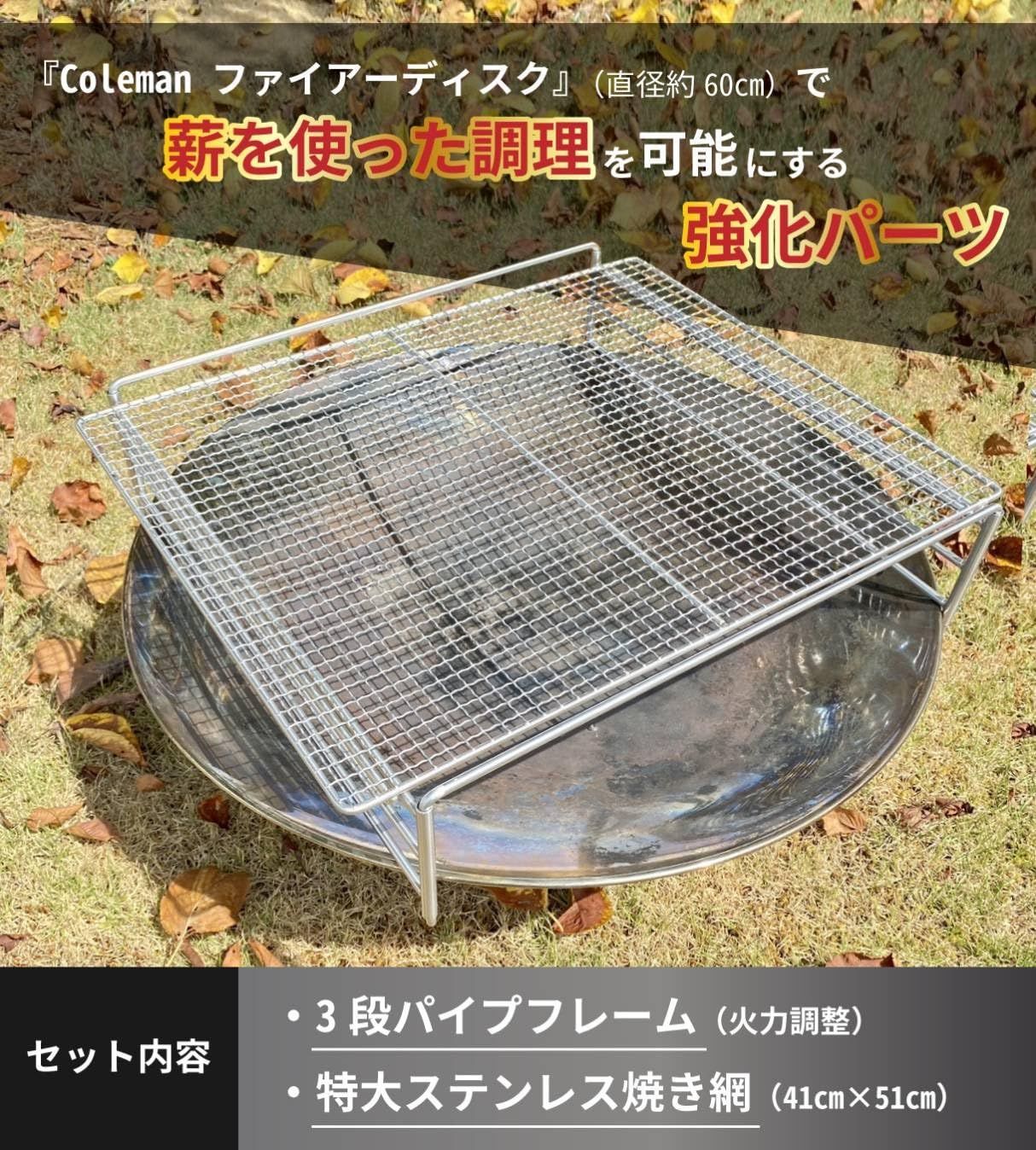 大人気商品のColemanファイヤーディスク焚き火台カスタムパーツ! 何度もお客様からお問い合わせをいただき直径60cmColemanファイヤーディスク焚き火台に対応したサイズで設計いたしました。 3段階の火加減調整を可能にし薪入れをしやすく嵩上げしてくれる3段パイプフレーム!ステンレス製で落下防止も付いた専用網のセット商品となります。 廃盤商品となったファイヤーディスクプラス、ファイヤーディスクマックスのサイズに対応した商品となります。 商品詳細】 商品: パイプフレーム2個 コノ字フレーム2個 専用焼き網1個 サイズ: コの字フレーム 120×445 300g(2個) パイプフレーム 100×445 600g(2個) 専用焼き網 410×510 φ1.2クリンプ網 900g 材質: 18-8ステンレス