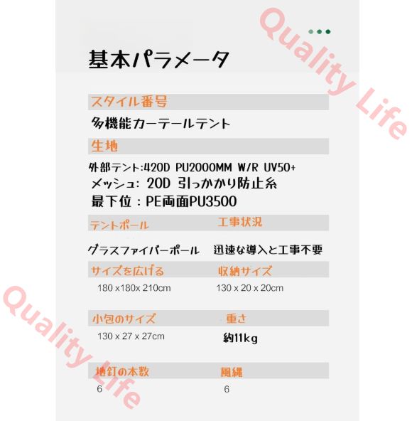 「セット内容」テント*1ボトム*1リアスカート*1レインカバー*1キャンプライト*1防湿マット*1フロアネイル*6ドローストリング*6ドアポール*4バックパック*1