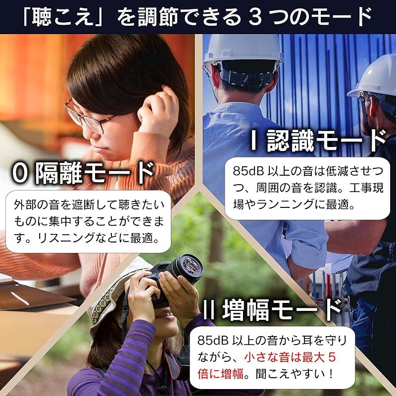 シーンに合わせて選択できる3つのモードが特徴。外部の音をシャットアウトし、集中したい時には0の隔離モードを。音量を上げなくてもクリアに聞こえるので、耳を痛める心配がありません。また、ランニングなどの屋外使用にはの認識モードを。85dbを超える騒音はカットしつつ、車や人の声など周囲の音はほどよく聴こえて安全にお過ごしいただけます。より繊細に周囲の音を「聴く」時にはの増幅モードを。同じく85dbを超える騒音はカットし、なんと小さな音を5倍増幅。小さい声も聞こえやすくなります。